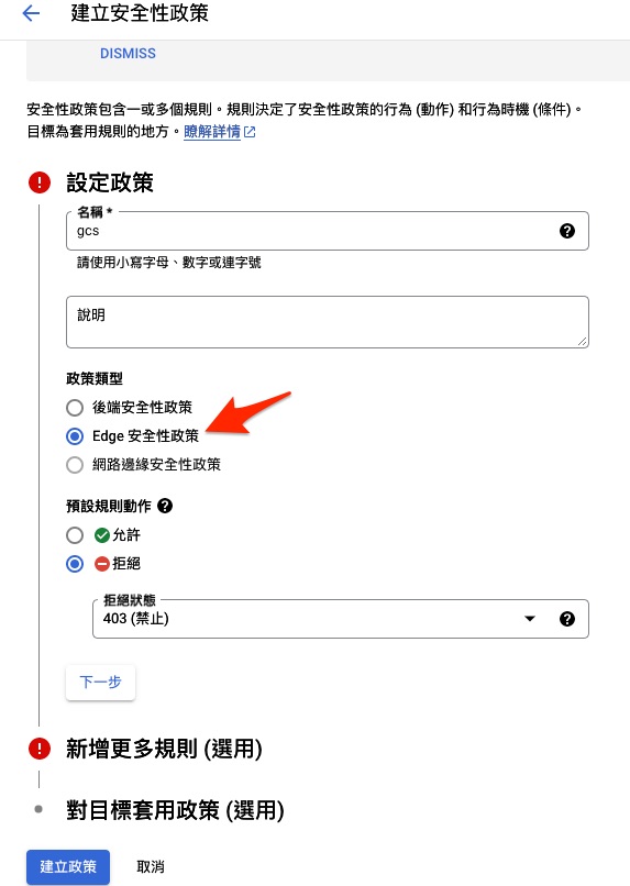 新增的時候,選擇 Edge安全性政策,如果沒看到這個選項,